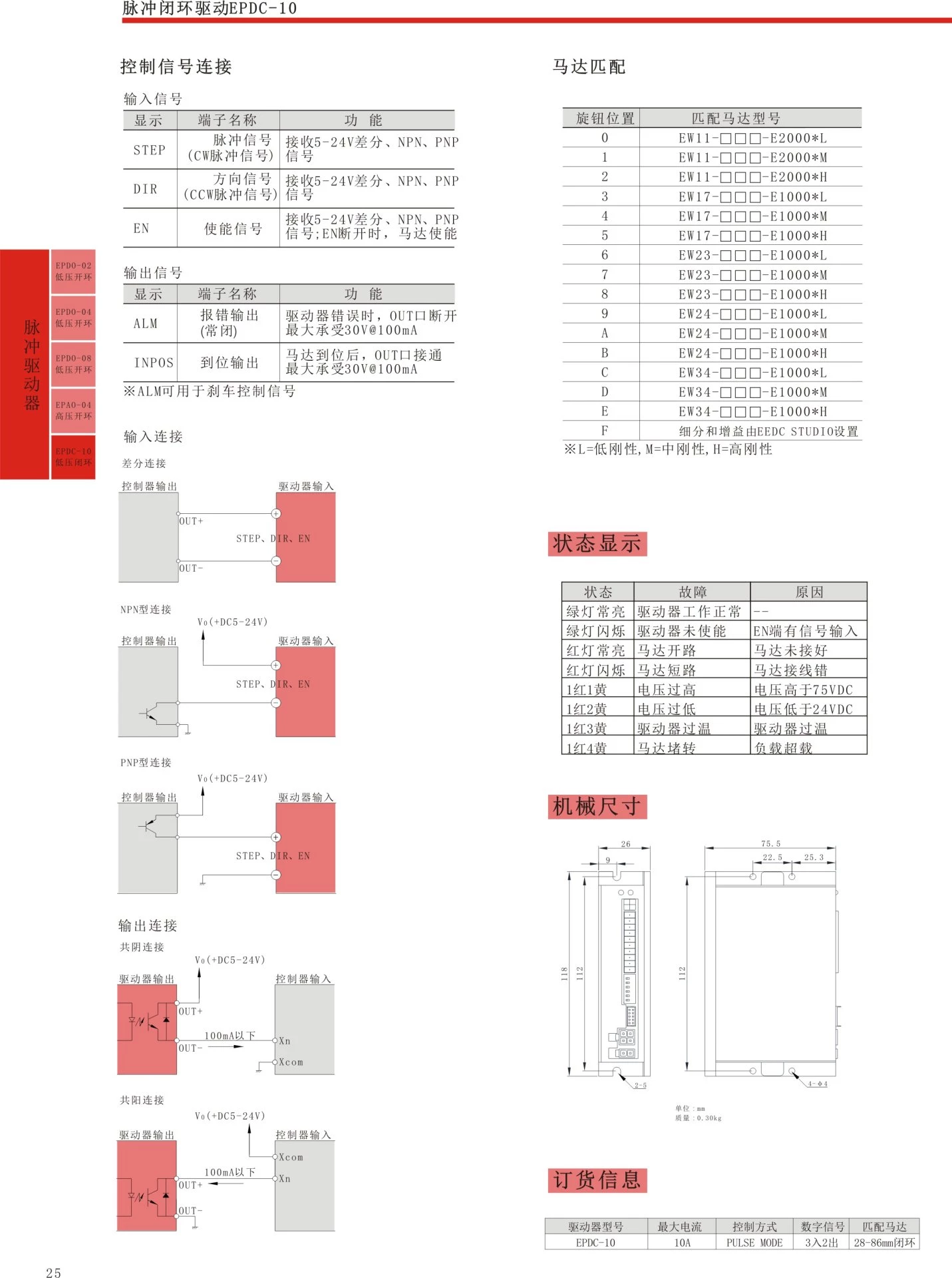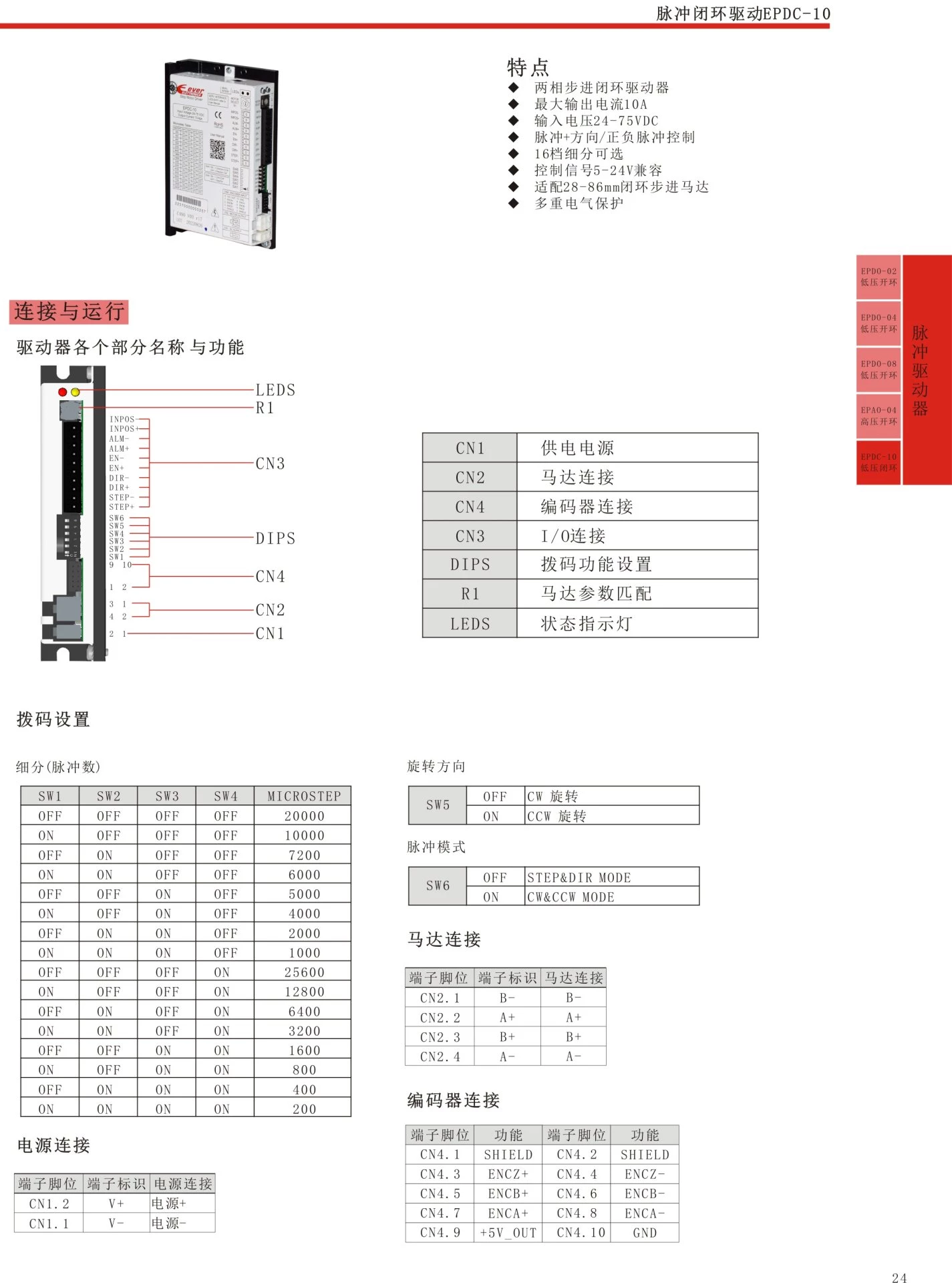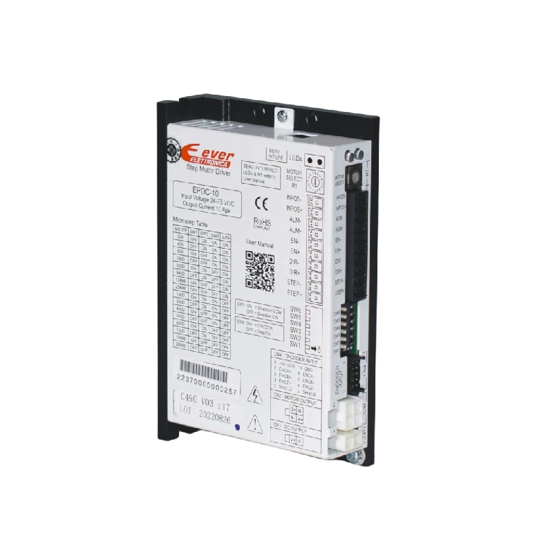 Two phase stepper closed-loop driver, maximum output current 10A, input voltage 24-75VDC, pulse+direction/positive/negative pulse control, 16 level subdivision, optional control signal 5-24V, compatible with 28-86mm closed-loop stepper motor, multiple electrical protections