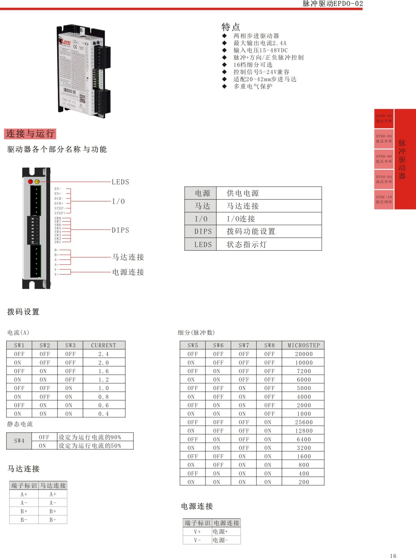 Two phase stepper driver, maximum output current 2.4A, input voltage 15-48VDC, pulse+direction/positive/negative pulse control, 16 level subdivision optional control, signal 5-24V, compatible with 20-42mm stepper motors, multiple electrical protections