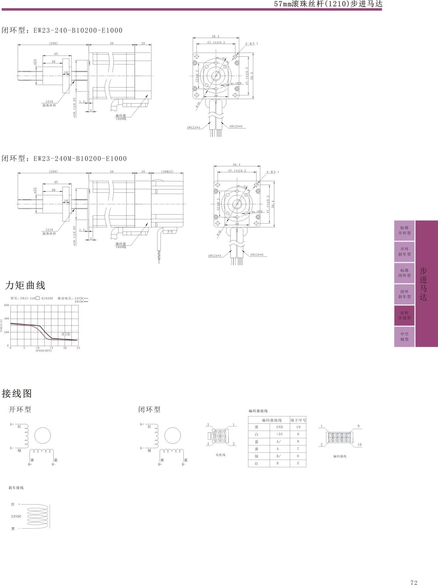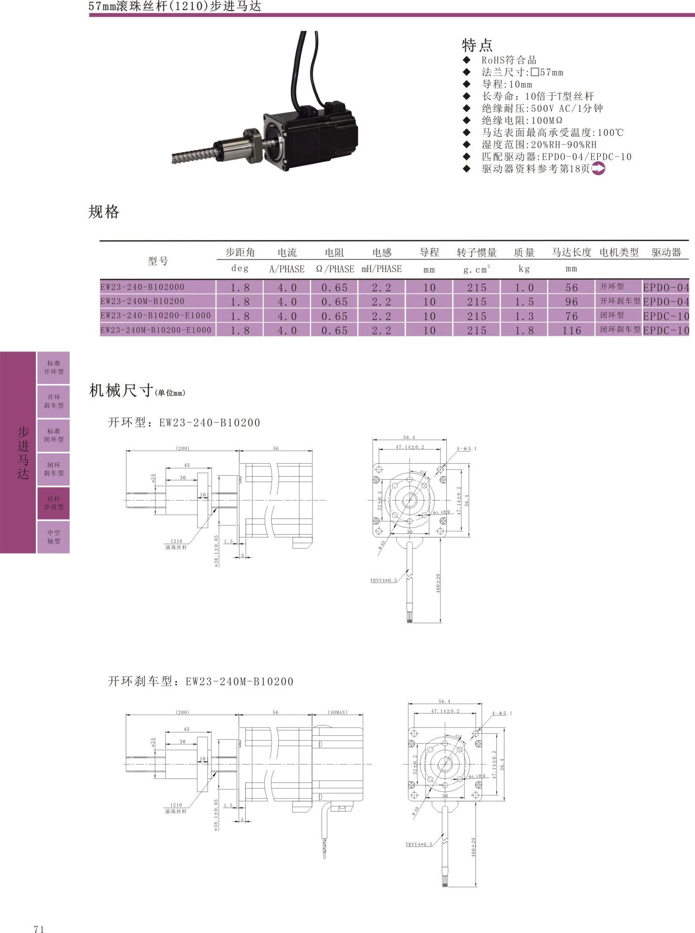RoHS compliant flange, size: 57mm, lead: 10mm, long life: 10 times longer than T-shaped screw, insulation withstand voltage: 500VAC/1 minute, insulation resistance: 100MR, maximum temperature tolerance of motor surface: 100 ℃, humidity range: 20% RH-90% RH, matched driver: EPD0-04/EPDC-10