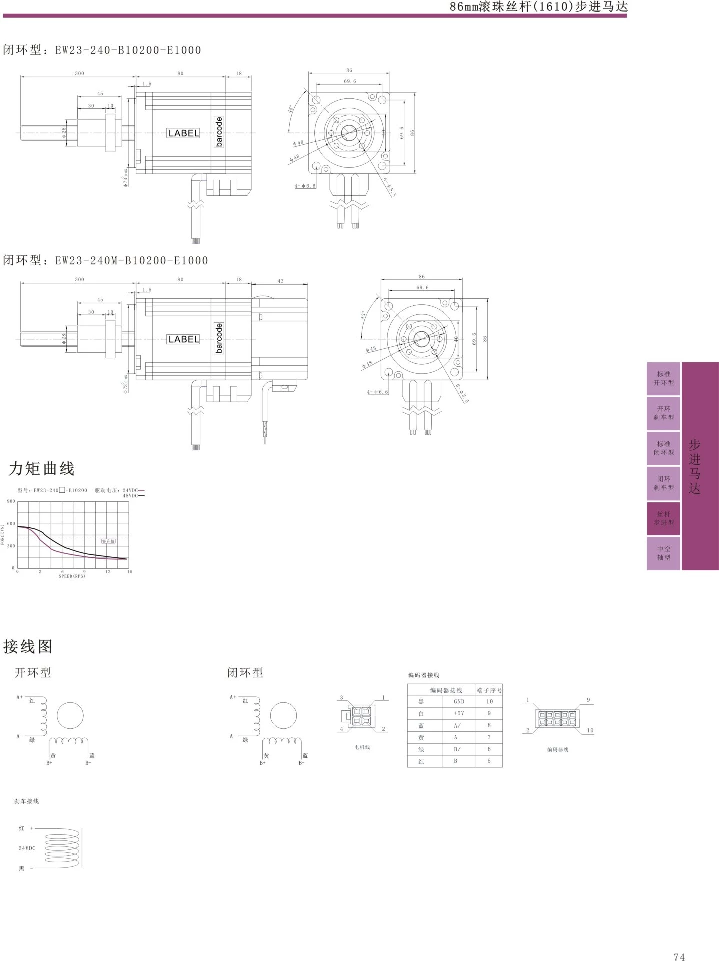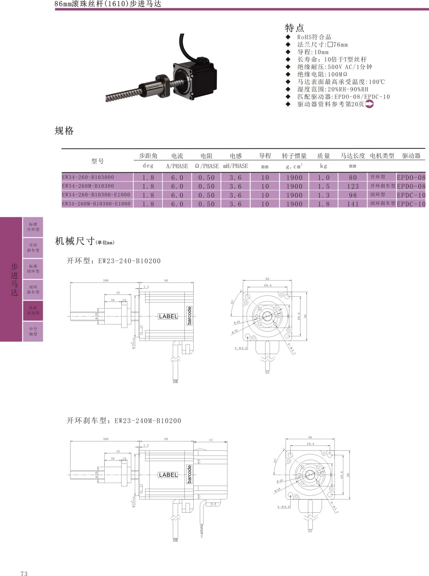RoHS compliant flange, size: 76mm, lead: 10mm, long life: 10 times longer than T-shaped screw, insulation withstand voltage: 500VAC/1 minute, insulation resistance: 100MQ, maximum temperature tolerance of motor surface: 100 ℃, humidity range: 20% RH-90% RH, matched driver: EPD0-08/EPDC-10