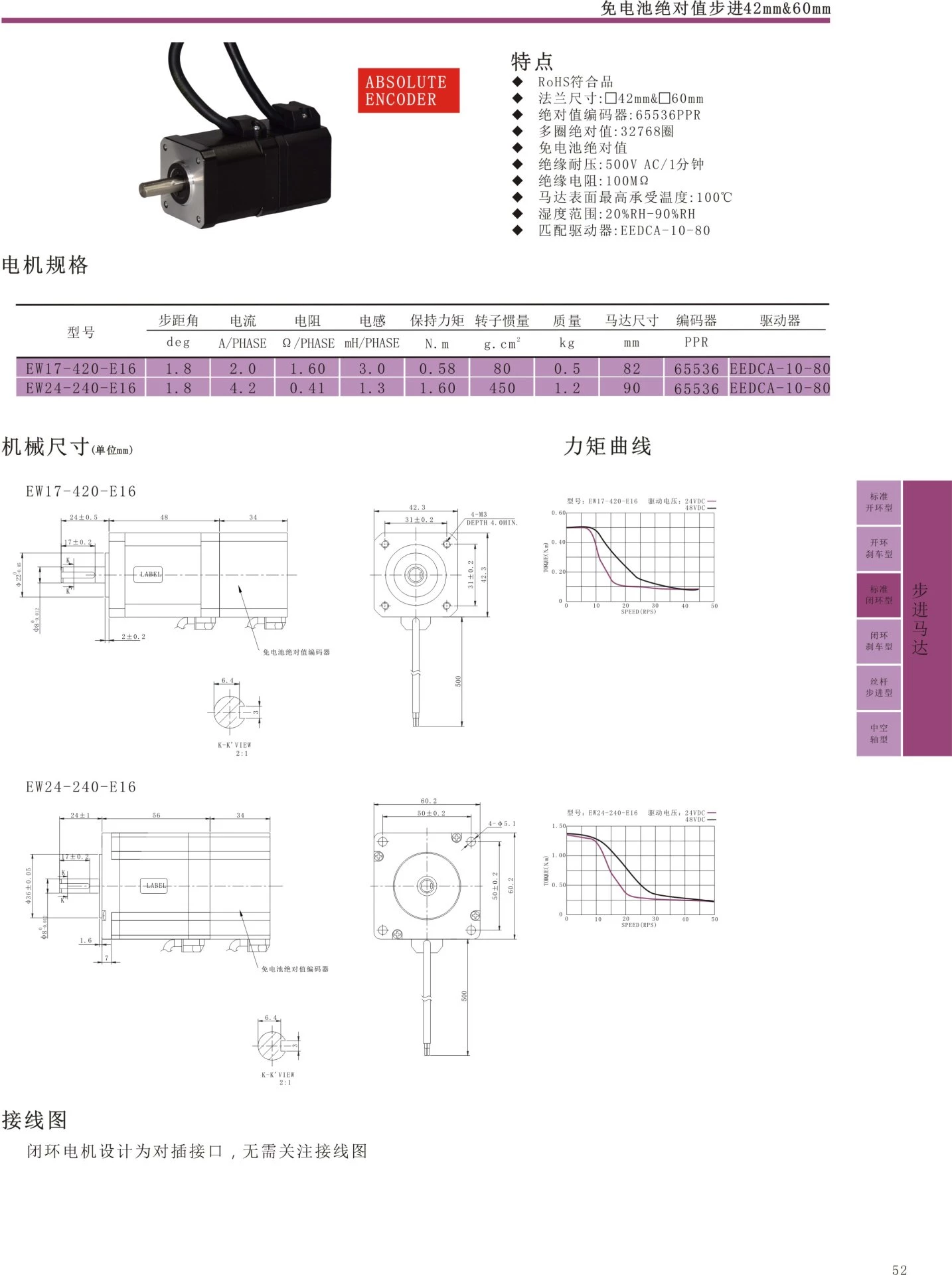 RoHS compliant flange, size: 42mm&60mm, absolute encoder: 65536PPR, multi turn absolute value: 32768 turns, battery free absolute value, insulation withstand voltage: 500VAC/1 minute, insulation resistance: 100MQ, maximum temperature tolerance of motor surface: 100 ℃, humidity range: 20% RH-90% RH, matched driver: EEDCA-10-80