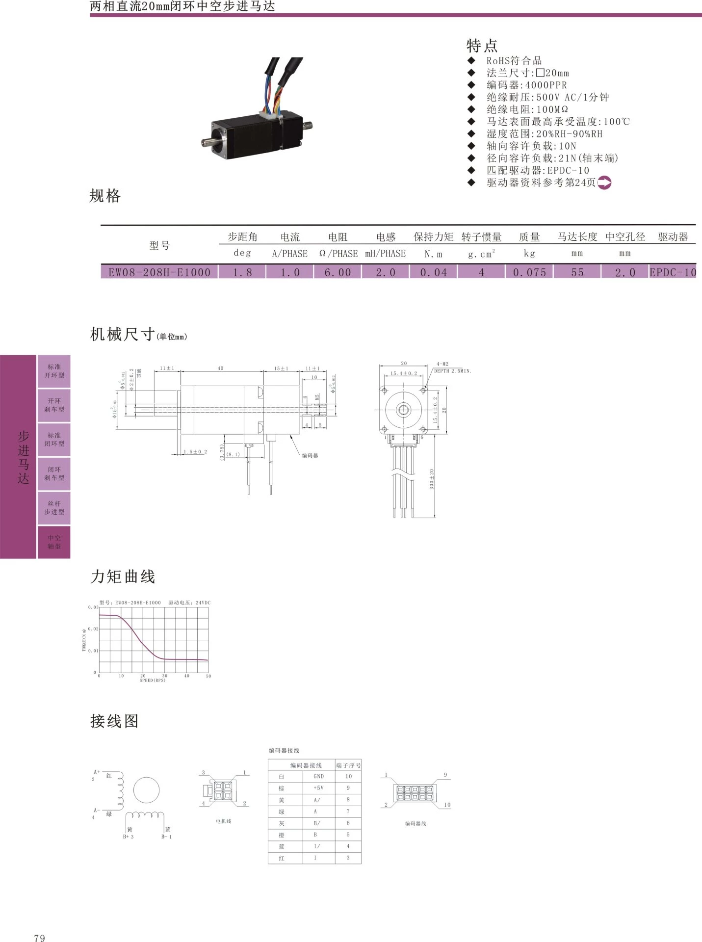 RoHS compliant flange, size: 20mm, encoder: 4000PPR, insulation withstand voltage: 500VAC/1 minute, insulation resistance: 100MQ, maximum surface temperature of motor: 100 ℃, humidity range: 20% RH-90% RH, axial allowable load: 10N, radial allowable load: 21N (shaft end), matched driver: EPDC-10