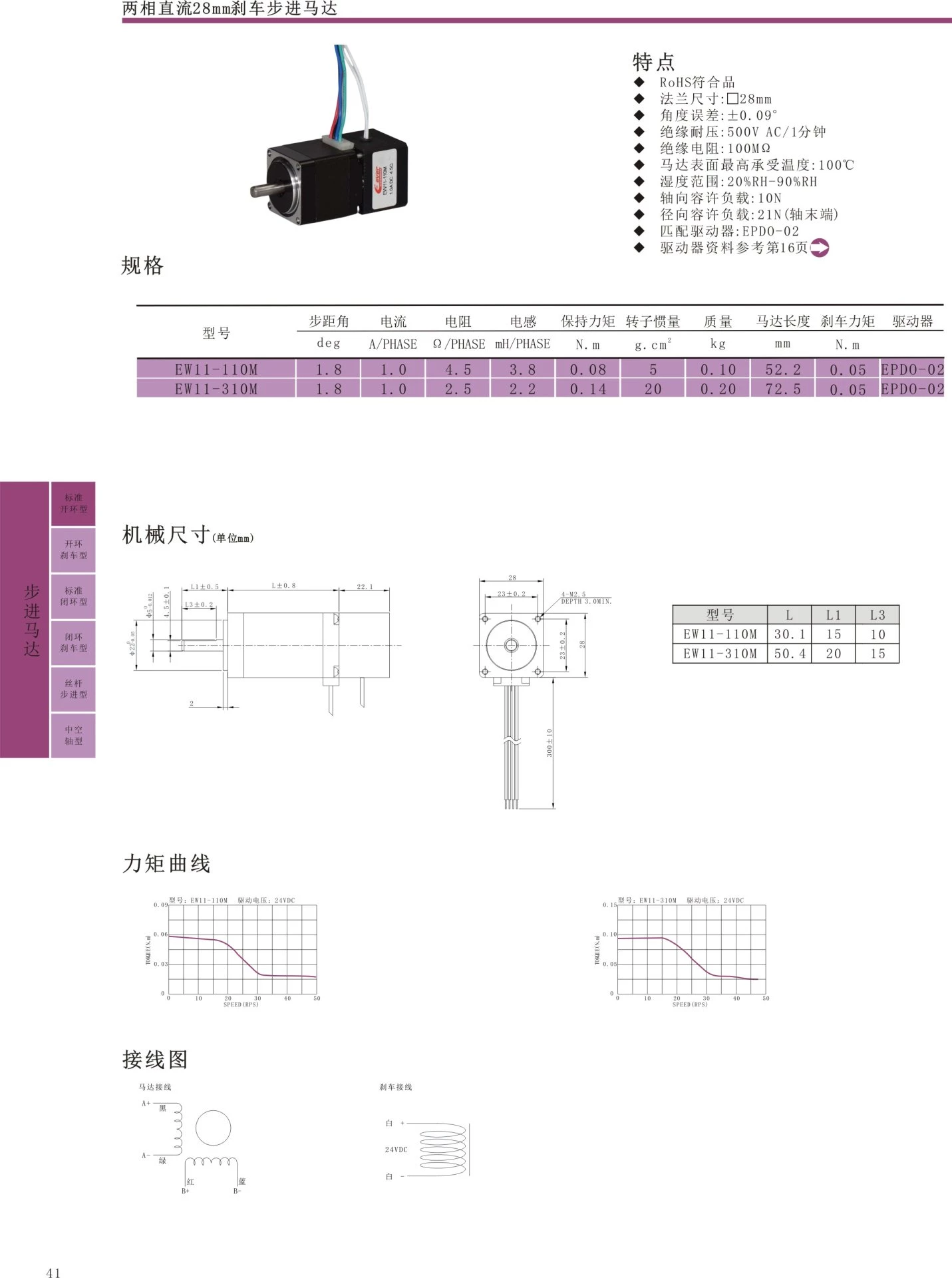 RoHS compliant flange, size: 28mm, angle error: ± 0.09, insulation withstand voltage: 500VAC/1 minute, insulation resistance: 100MQ, maximum surface temperature of motor: 100 ℃, humidity range: 20% RH-90% RH, axial allowable load: 60N, radial allowable load: 220N (shaft end), matched driver: EPD0-04