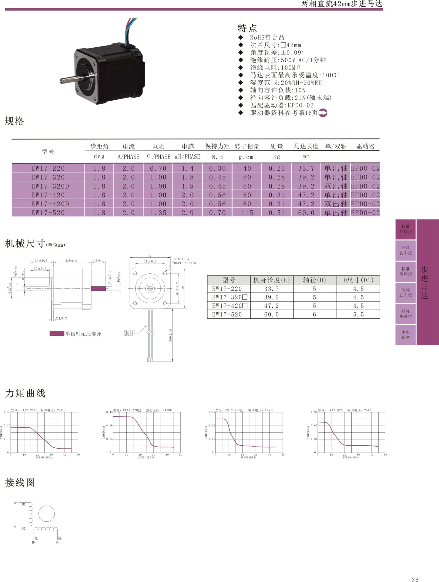 RoHS compliant flange, size: 42mm, angle error: ± 0.099, insulation withstand voltage: 1500VAC/1 minute, insulation resistance: 100MQ, maximum surface temperature of motor: 100 ℃, humidity range: 20% RH-90% RH, axial allowable load: 60N, radial allowable load: 220N (shaft end), matched driver: EPA0-04