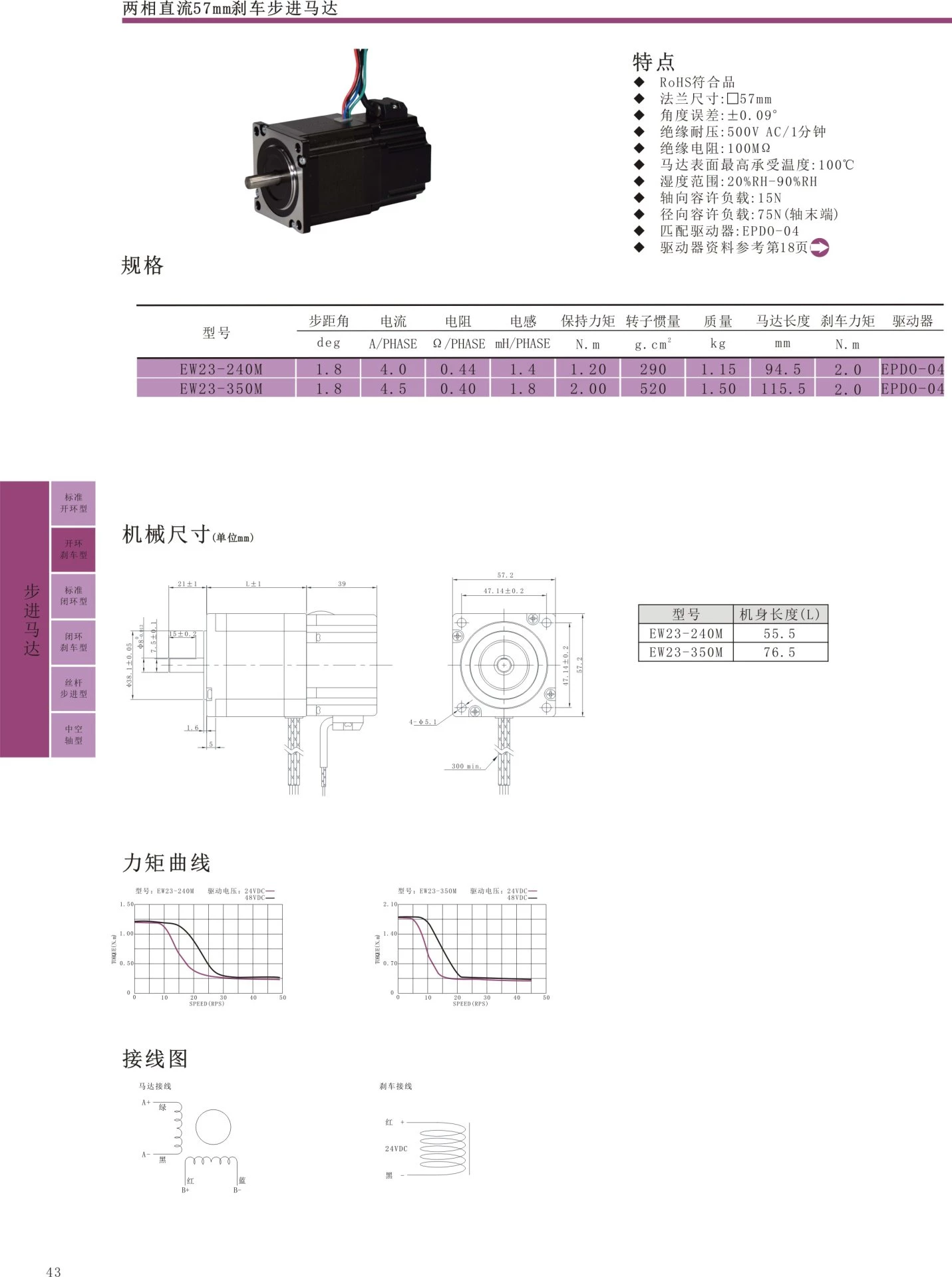RoHS compliant flange, size: 57mm, angle error: ± 0.09, insulation withstand voltage: 500VAC/1 minute, insulation resistance: 100MQ, maximum surface temperature of motor: 100 ℃, humidity range: 20% RH-90% RH, axial allowable load: 60N, radial allowable load: 220N (shaft end), matched driver: EPD0-04