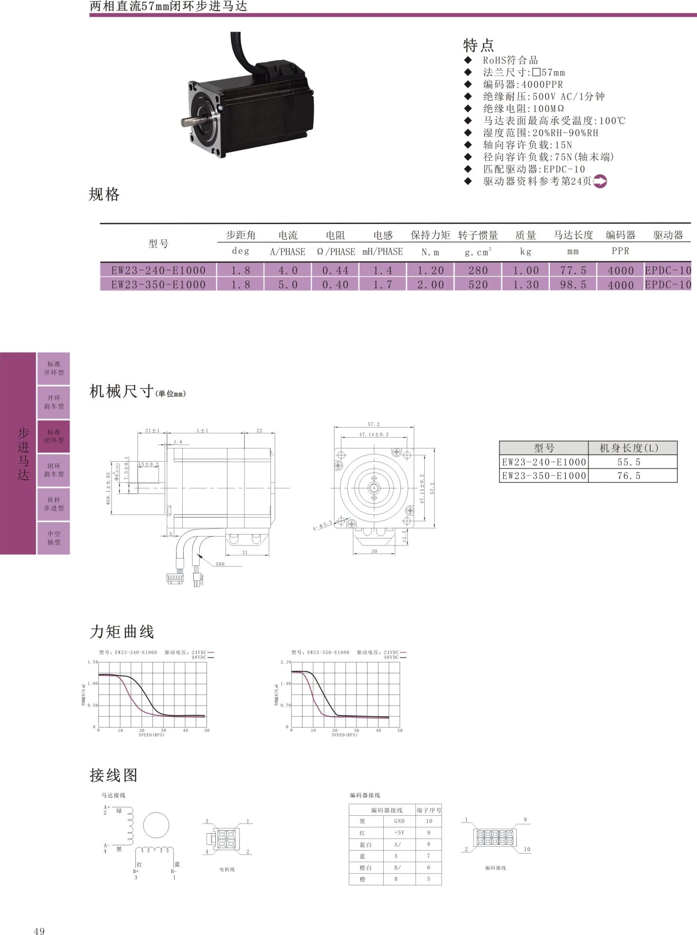RoHS compliant flange, size: 57mm, encoder: 4000PPR, insulation withstand voltage: 500VAC/1 minute, insulation resistance: 100MQ, motor surface maximum temperature: 100 ℃, humidity range: 20% RH-90% RH, axial allowable load: 60N, radial allowable load: 75N (shaft end), matched driver: EPDC-10