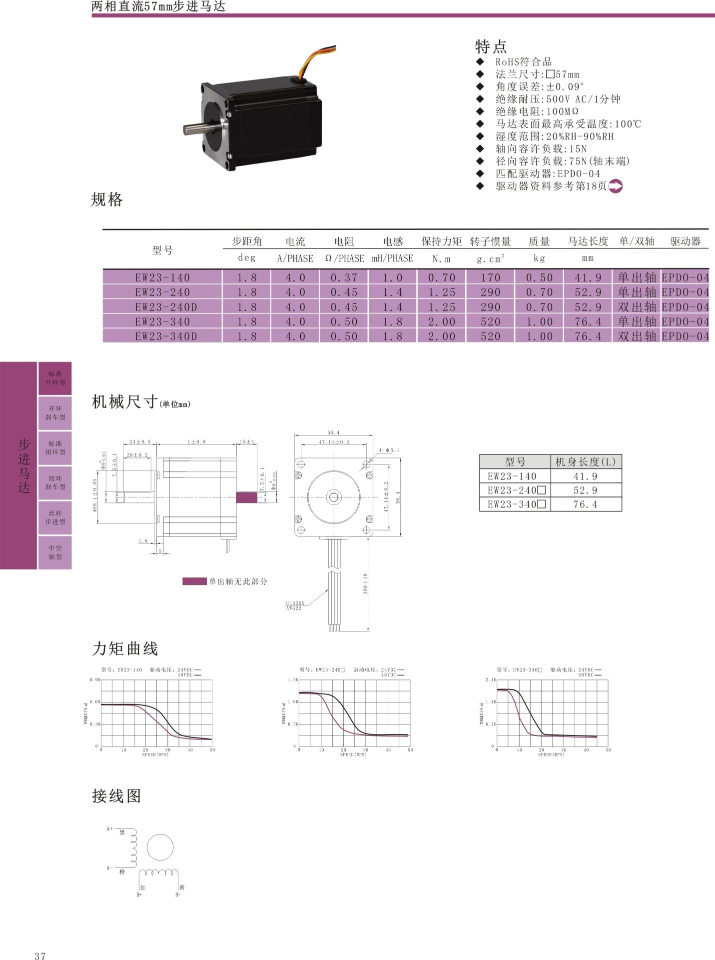 RoHS compliant flange, size: 57mm, angle error: ± 0.099, insulation withstand voltage: 1500VAC/1 minute, insulation resistance: 100MQ, maximum surface temperature of motor: 100 ℃, humidity range: 20% RH-90% RH, axial allowable load: 60N, radial allowable load: 220N (shaft end), matched driver: EPA0-04
