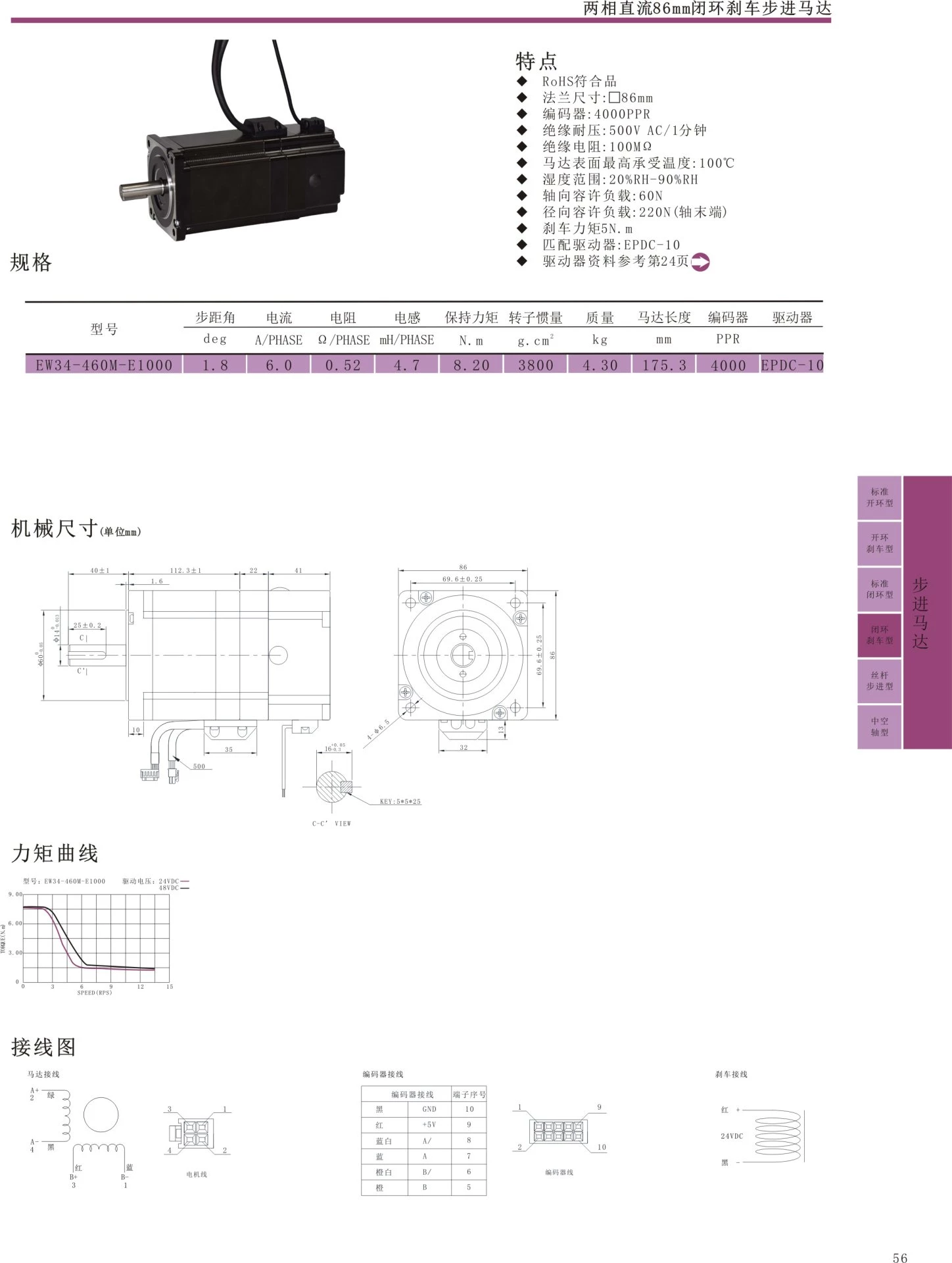 RoHS compliant flange, size: 86mm, encoder: 4000PPR, insulation withstand voltage: 500VAC/1 minute insulation, resistance: 100MQ, maximum temperature tolerance of motor surface: 100 ℃, humidity range: 20% RH-90% RH,