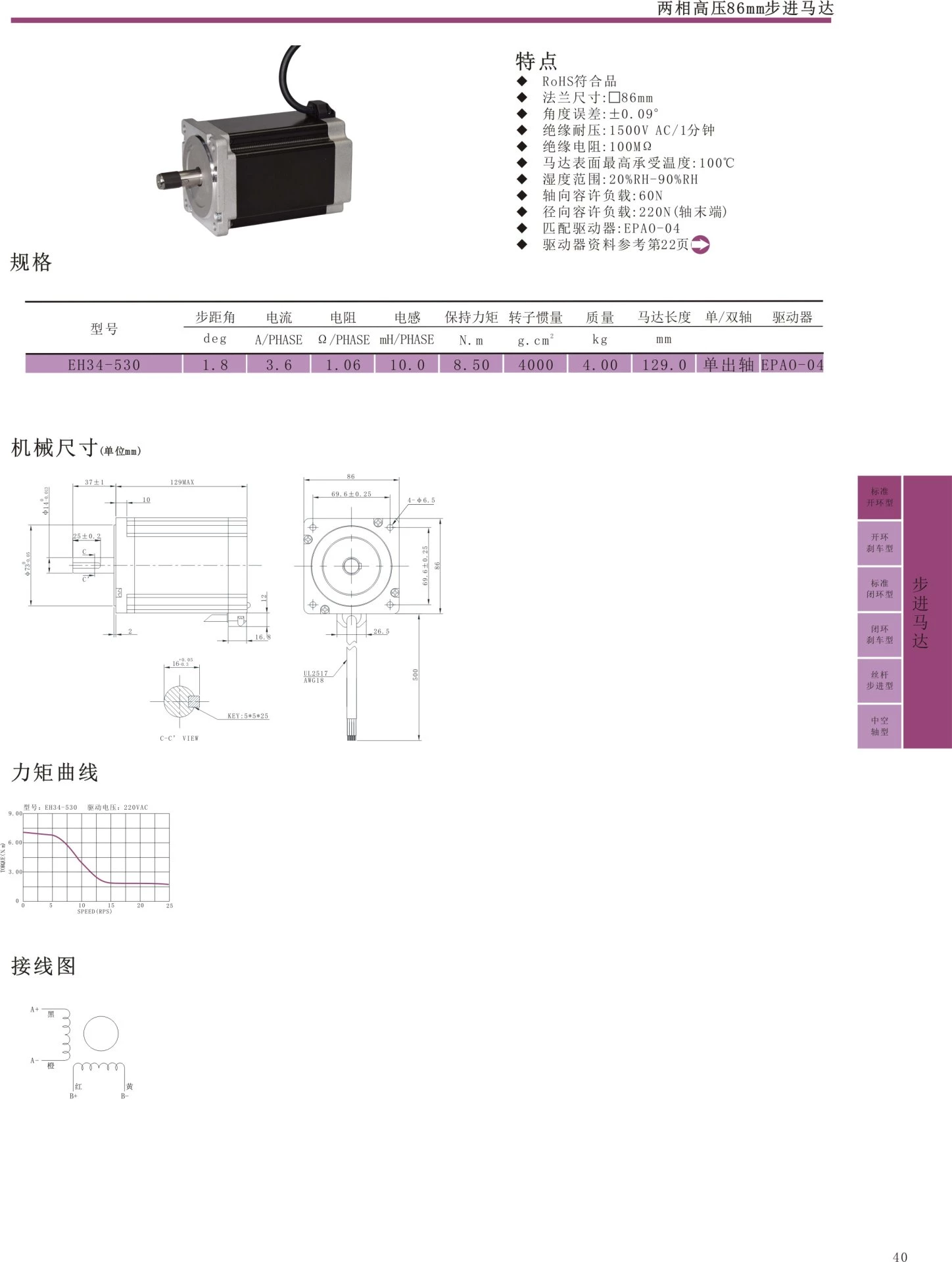 RoHS compliant flange, size: 86mm, angle error: ± 0.099, insulation withstand voltage: 1500VAC/1 minute, insulation resistance: 100MQ, maximum surface temperature of motor: 100 ℃, humidity range: 20% RH-90% RH, axial allowable load: 60N, radial allowable load: 220N (shaft end), matched driver: EPA0-04